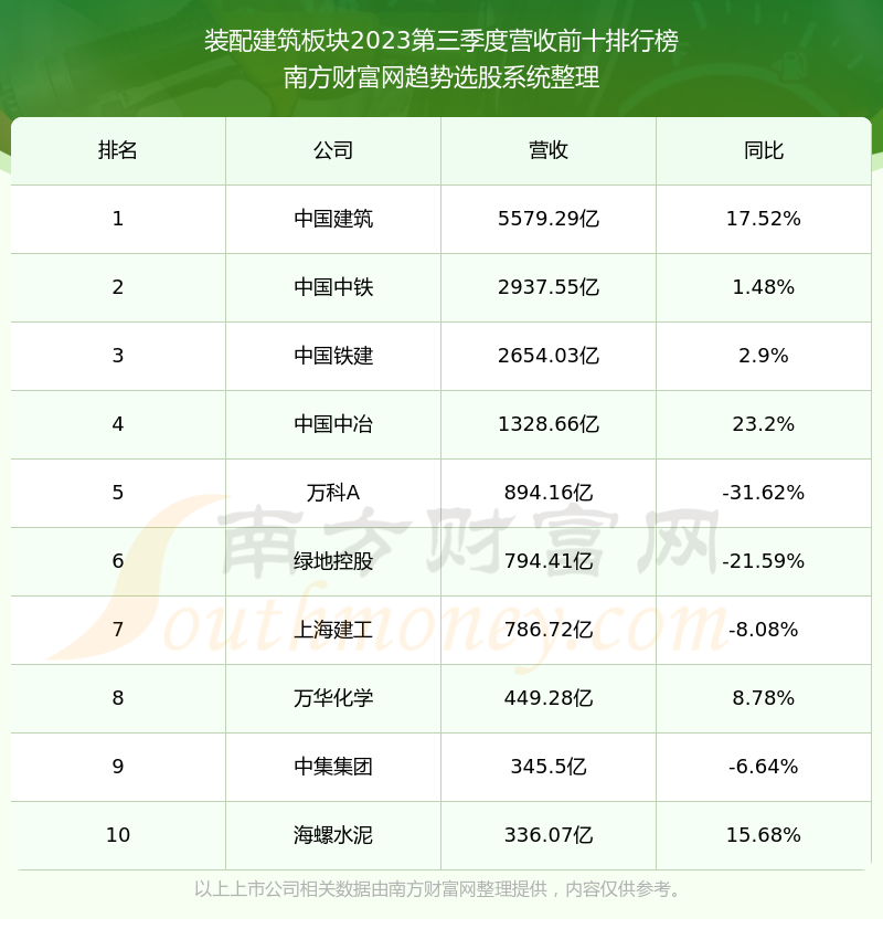 按照南方财富网趋势选股系统统计,该股所属板块为装配建筑板块,该板块共有93只股票,中衡设计2023第三季度营收在该板块中排名为第66名,该板块2023第三季度营收排名前十的股票如下表: