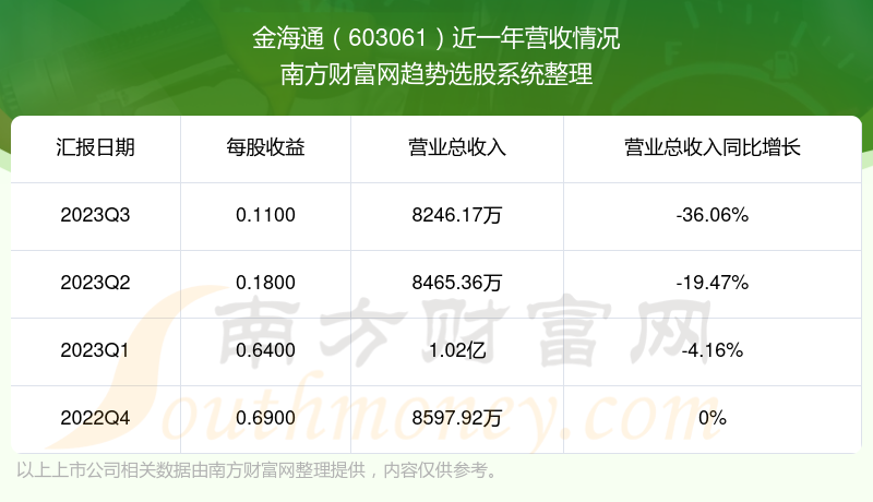 金海通2023年第三季度显示,公司主营收入8246.17万元,同比-36.06%;归母净利润776.06万元,同比-83.23%;扣非净利润628.38万元。