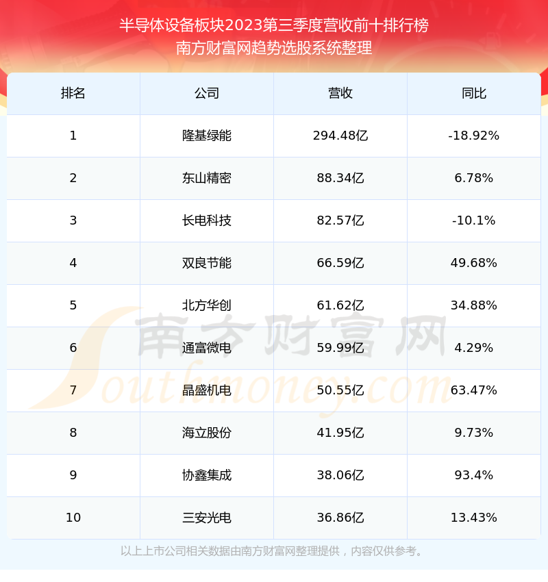 按照南方财富网趋势选股系统统计,该股所属板块为半导体设备板块,该板块共有136只股票,金海通2023第三季度营收在该板块中排名为第128名,该板块2023第三季度营收排名前十的股票如下表: