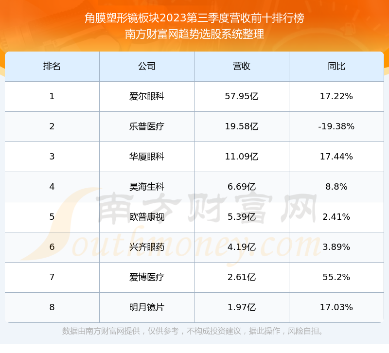 按照南方财富网趋势选股系统统计,该股所属板块为角膜塑形镜板块,该板块共有8只股票,爱博医疗2023第三季度营收在该板块中排名为第7名,该板块2023第三季度营收排名前十的股票如下表:
