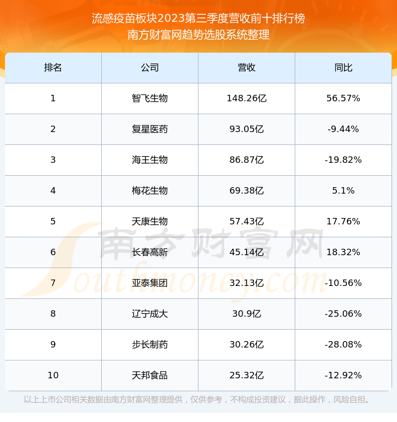 按照南方财富网趋势选股系统统计,该股所属板块为流感疫苗板块,该板块共有37只股票,金迪克2023第三季度营收在该板块中排名为第37名,该板块2023第三季度营收排名前十的股票如下表: