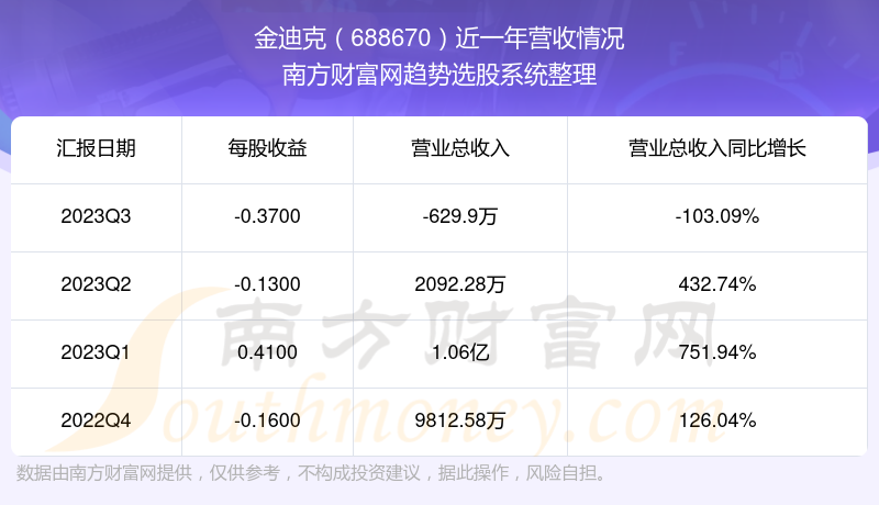 A股上市公司金迪克(代码:688670)发布2023年第三季度财报,公司2023年第三季度归属于上市公司股东的净利润为-4615.81万元,净利润同比增长-163.34%,环比增长-3548.43%。