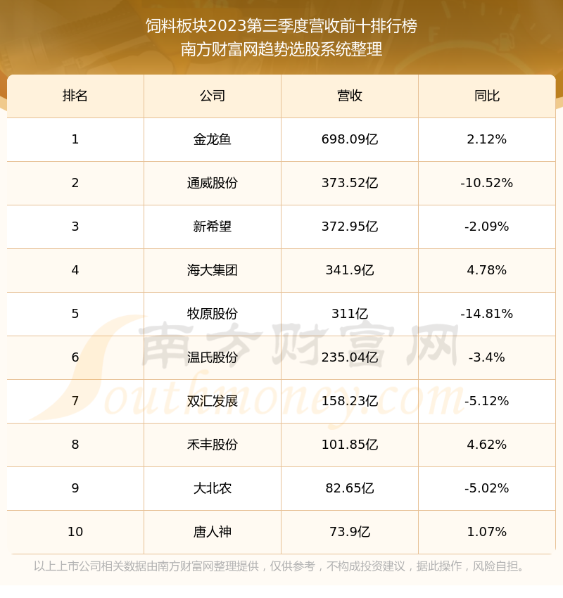 按照南方财富网趋势选股系统统计,该股所属板块为饲料板块,该板块共有73只股票,天马科技2023第三季度营收在该板块中排名为第26名,该板块2023第三季度营收排名前十的股票如下表: