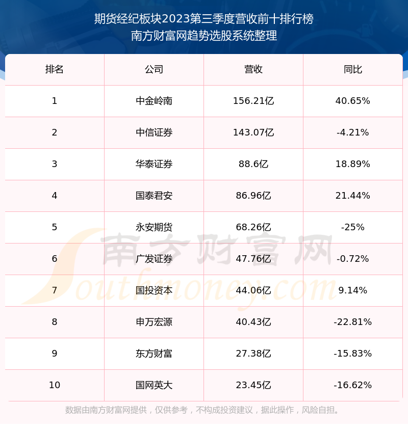 按照南方财富网趋势选股系统统计,该股所属板块为期货经纪板块,该板块共有25只股票,永安期货2023第三季度营收在该板块中排名为第5名,该板块2023第三季度营收排名前十的股票如下表: