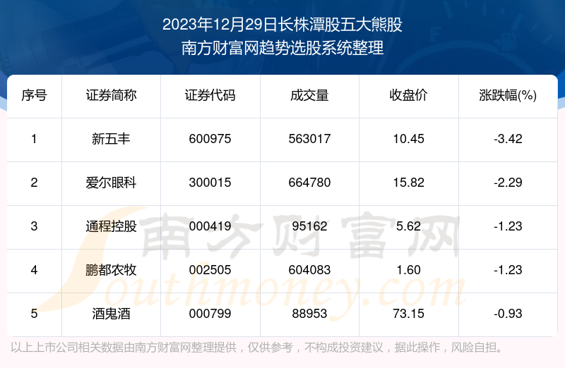 截止2023年12月29日,个股表现方面,长株潭股当日领跌股为新五丰(600975),该股当日报收10.45,上涨-3.42%,成交量56.3万。爱尔眼科(300015)以下跌-2.29%紧随其后,该股当日成交量66.48万。此外,通程控股(000419)、鹏都农牧(002505)、酒鬼酒(000799)均进入当日长株潭股熊股之列。
