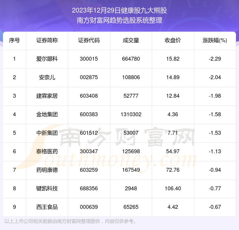 截止2023年12月29日,个股表现方面,健康股当日领跌股为爱尔眼科(300015),该股当日报收15.82,上涨-2.29%,成交量66.48万。安奈儿(002875)以下跌-2.04%紧随其后,该股当日成交量10.88万。此外,建霖家居(603408)、金地集团(600383)、中新集团(601512)均进入当日健康股熊股之列。