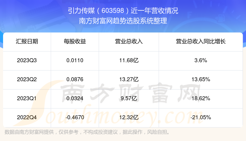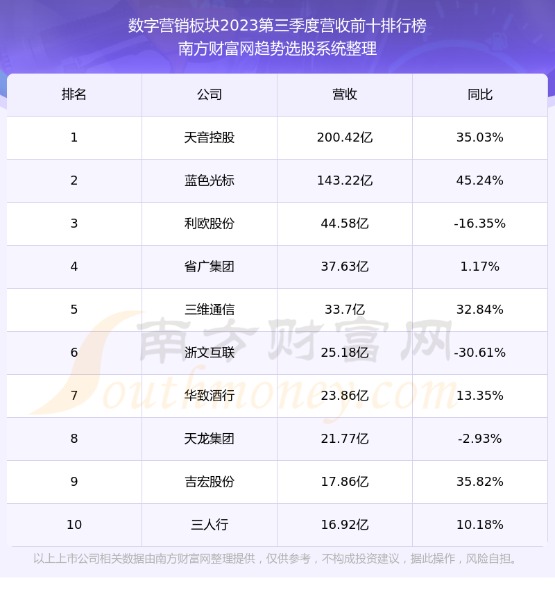 按照南方财富网趋势选股系统统计,该股所属板块为数字营销板块,该板块共有61只股票,引力传媒2023第三季度营收在该板块中排名为第16名,该板块2023第三季度营收排名前十的股票如下表: