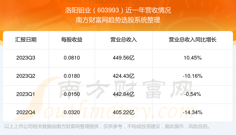 洛阳钼业2023年第三季度公司实现营业收入449.56亿元,同比10.45%;归母净利润17.4亿元,同比50.26%。