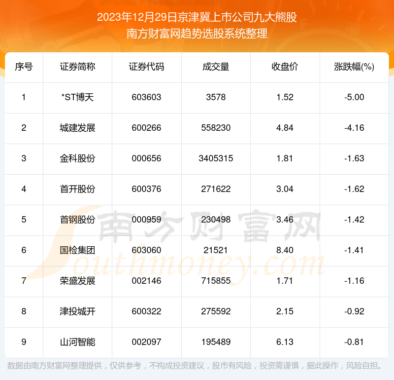 截止2023年12月29日,个股表现方面,京津冀上市公司当日领跌股为*ST博天(603603),该股当日报收1.52,上涨-5.00%,成交量0.36万。城建发展(600266)以下跌-4.16%紧随其后,该股当日成交量55.82万。此外,金科股份(000656)、首开股份(600376)、首钢股份(000959)均进入当日京津冀上市公司熊股之列。