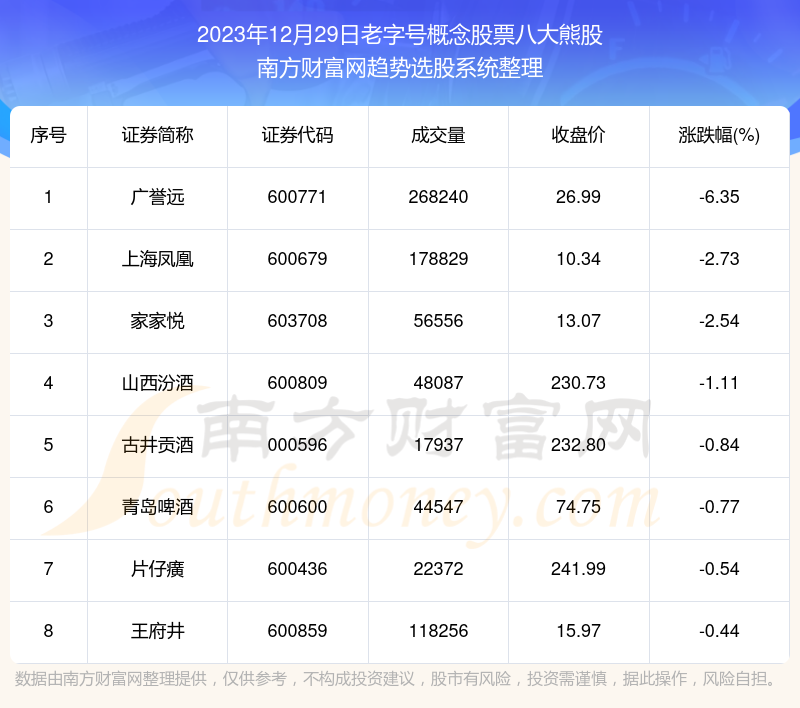 截止2023年12月29日,个股表现方面,老字号概念股票当日领跌股为广誉远(600771),该股当日报收26.99,上涨-6.35%,成交量26.82万。上海凤凰(600679)以下跌-2.73%紧随其后,该股当日成交量17.88万。此外,家家悦(603708)、山西汾酒(600809)、古井贡酒(000596)均进入当日老字号概念股票熊股之列。