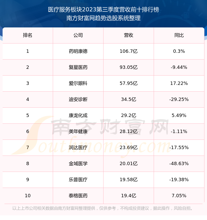 按照南方财富网趋势选股系统统计,该股所属板块为医疗服务板块,该板块共有73只股票,昭衍新药2023第三季度营收在该板块中排名为第27名,该板块2023第三季度营收排名前十的股票如下表: