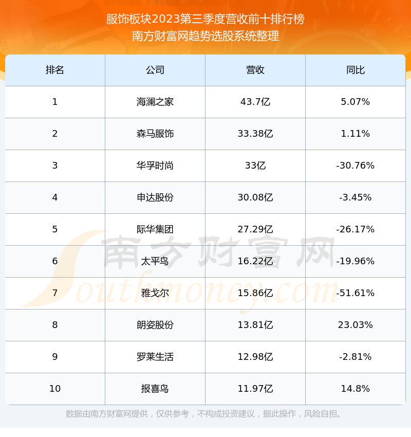 按照南方财富网趋势选股系统统计,该股所属板块为服饰板块,该板块共有59只股票,健盛集团2023第三季度营收在该板块中排名为第27名,该板块2023第三季度营收排名前十的股票如下表: