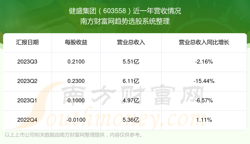 2023年第三季度,健盛集团营收同比-2.16%,净利润同比-4.46%。