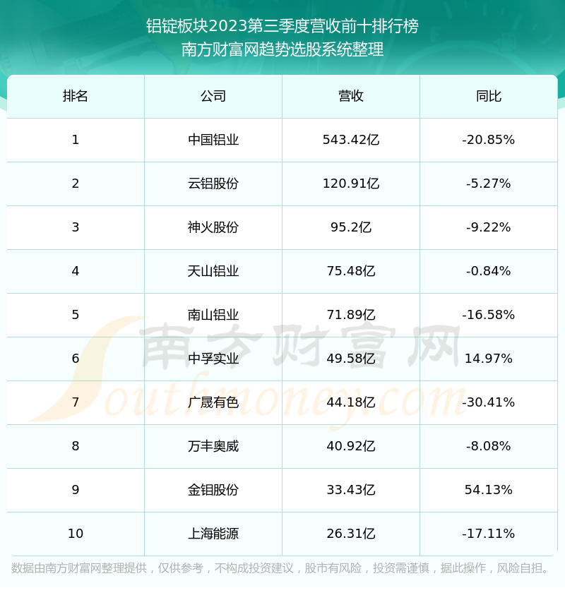 按照南方财富网趋势选股系统统计,该股所属板块为铝锭板块,该板块共有23只股票,怡球资源2023第三季度营收在该板块中排名为第13名,该板块2023第三季度营收排名前十的股票如下表: