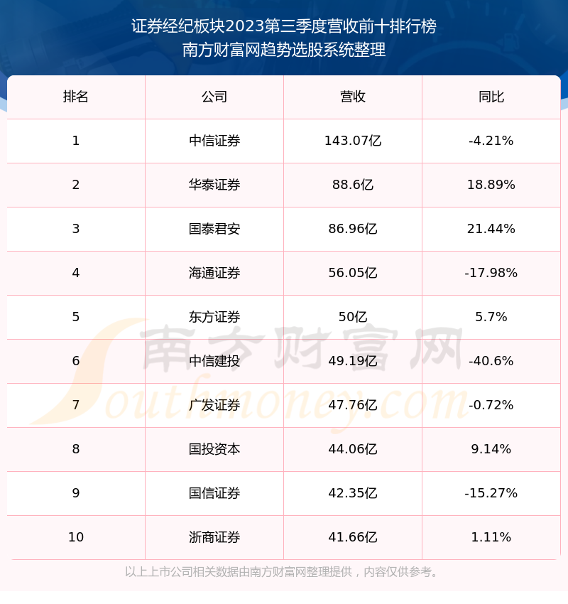 按照南方财富网趋势选股系统统计,该股所属板块为证券经纪板块,该板块共有36只股票,东方证券2023第三季度营收在该板块中排名为第5名,该板块2023第三季度营收排名前十的股票如下表: