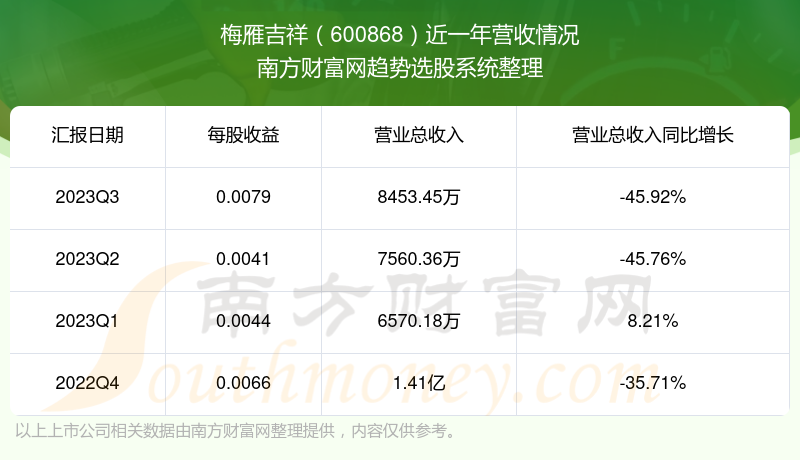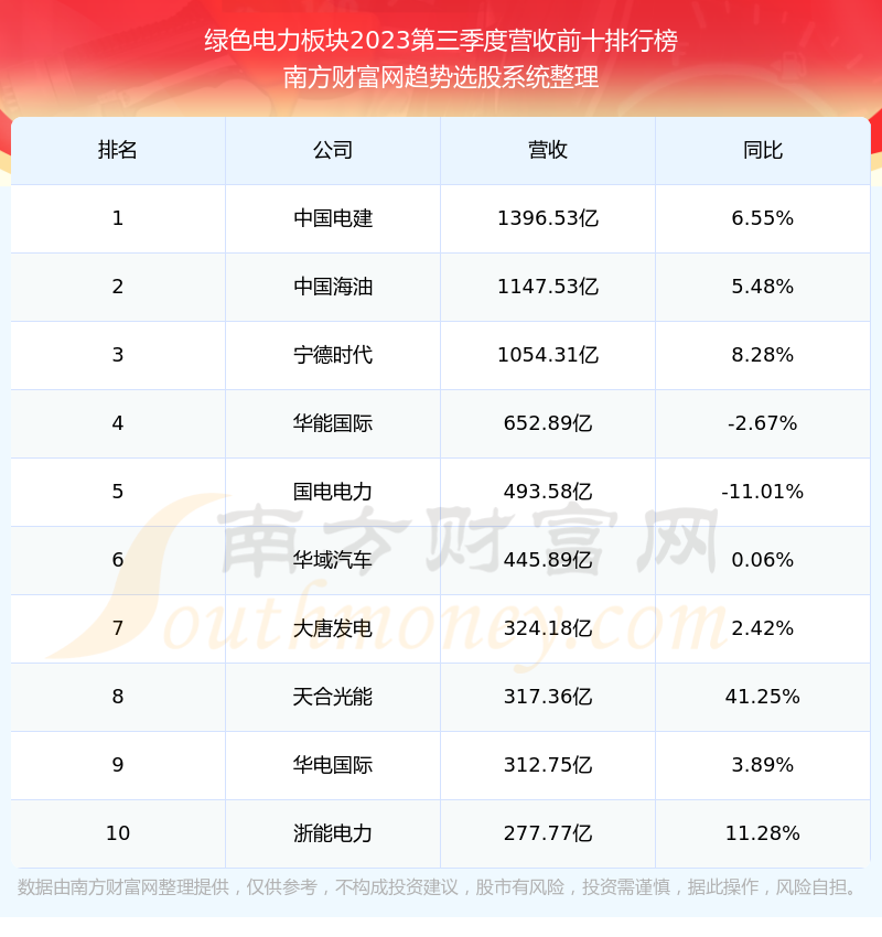 按照南方财富网趋势选股系统统计,该股所属板块为绿色电力板块,该板块共有221只股票,梅雁吉祥2023第三季度营收在该板块中排名为第217名,该板块2023第三季度营收排名前十的股票如下表: