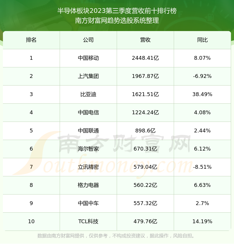 按照南方财富网趋势选股系统统计,该股所属板块为半导体板块,该板块共有487只股票,盛美上海2023第三季度营收在该板块中排名为第136名,该板块2023第三季度营收排名前十的股票如下表: