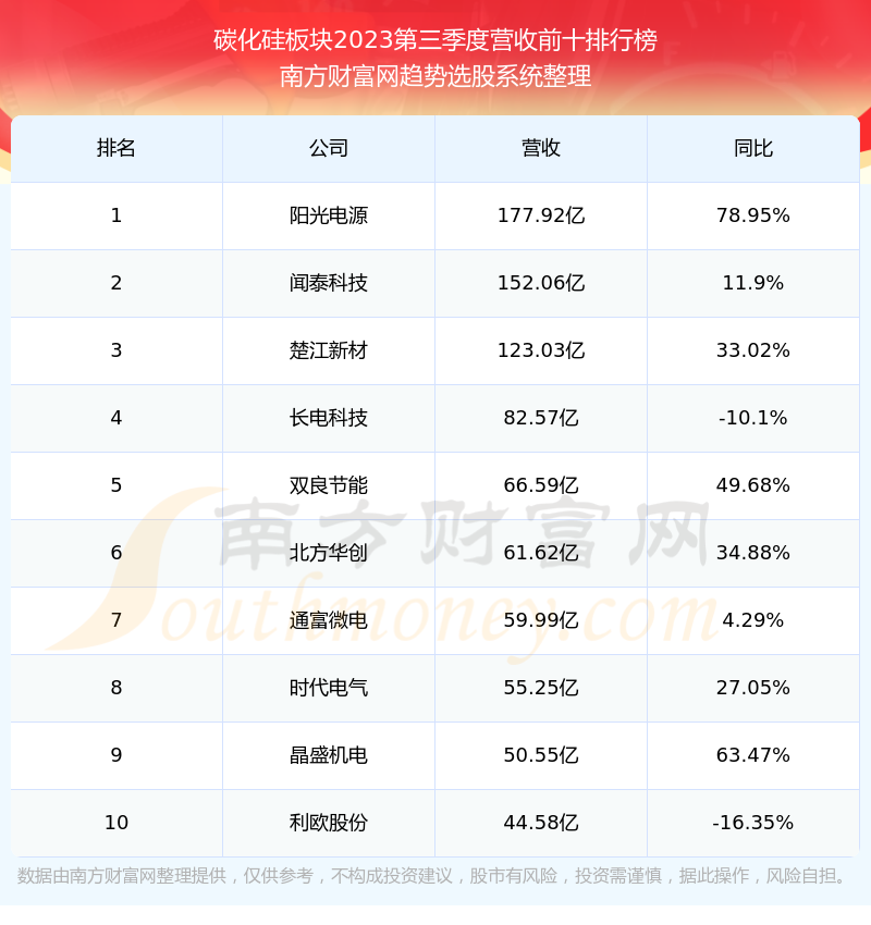 按照南方财富网趋势选股系统统计,该股所属板块为碳化硅板块,该板块共有67只股票,立霸股份2023第三季度营收在该板块中排名为第43名,该板块2023第三季度营收排名前十的股票如下表: