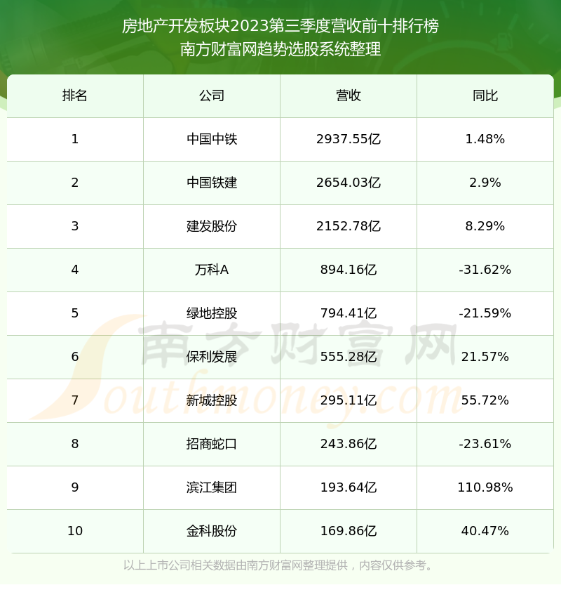 按照南方财富网趋势选股系统统计,该股所属板块为房地产开发板块,该板块共有141只股票,保利发展2023第三季度营收在该板块中排名为第6名,该板块2023第三季度营收排名前十的股票如下表: