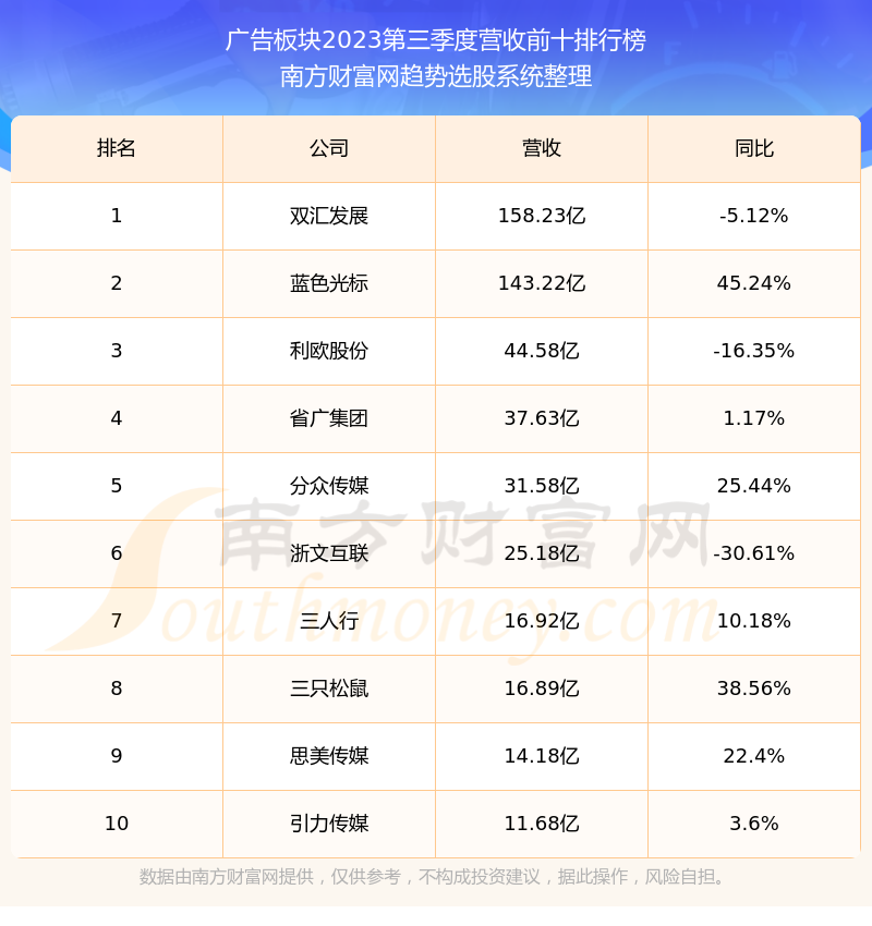 按照南方财富网趋势选股系统统计,该股所属板块为广告板块,该板块共有20只股票,博瑞传播2023第三季度营收在该板块中排名为第20名,该板块2023第三季度营收排名前十的股票如下表: