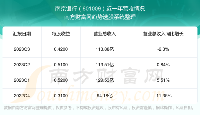 南京银行股票近一年营收情况如下表: