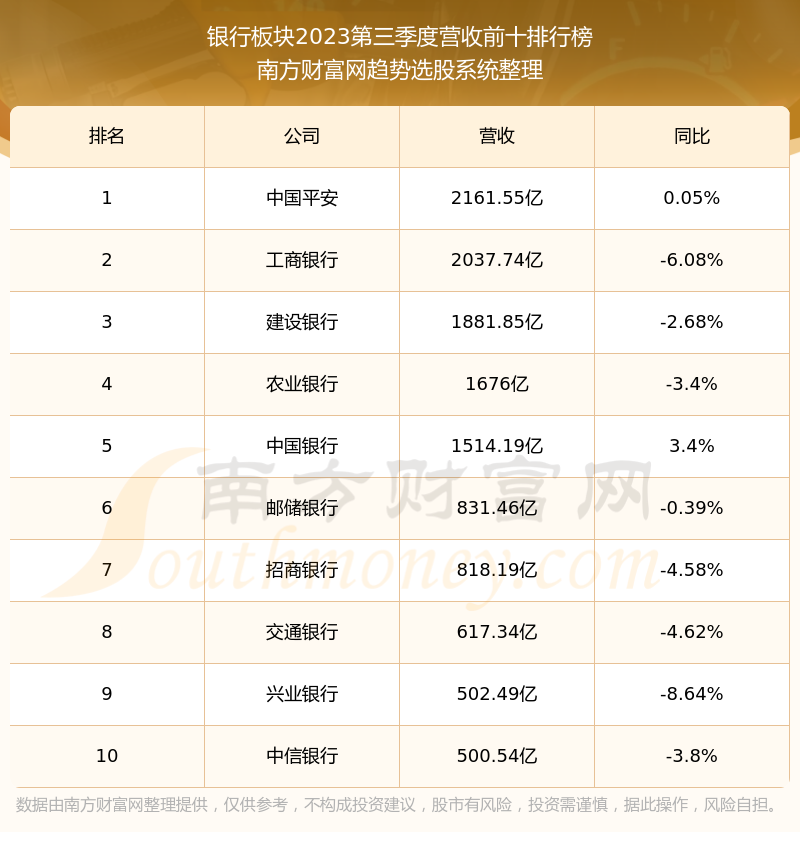 按照南方财富网趋势选股系统统计,该股所属板块为银行板块,该板块共有44只股票,南京银行2023第三季度营收在该板块中排名为第21名,该板块2023第三季度营收排名前十的股票如下表: