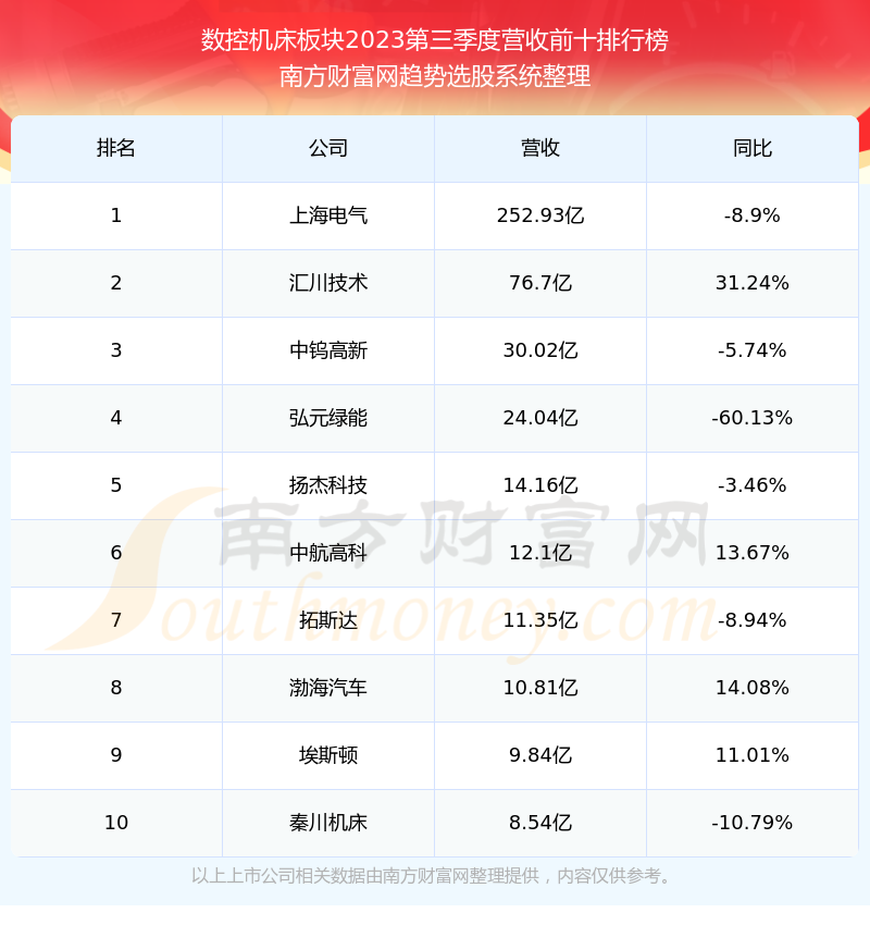 按照南方财富网趋势选股系统统计,该股所属板块为数控机床板块,该板块共有56只股票,海天精工2023第三季度营收在该板块中排名为第12名,该板块2023第三季度营收排名前十的股票如下表: