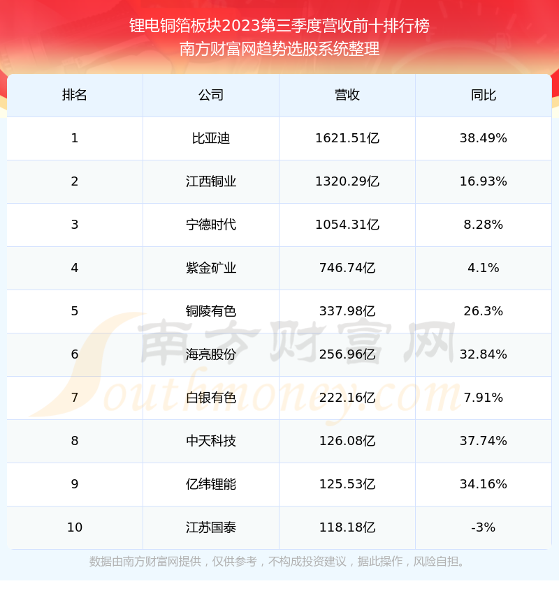 按照南方财富网趋势选股系统统计,该股所属板块为锂电铜箔板块,该板块共有35只股票,嘉元科技2023第三季度营收在该板块中排名为第19名,该板块2023第三季度营收排名前十的股票如下表: