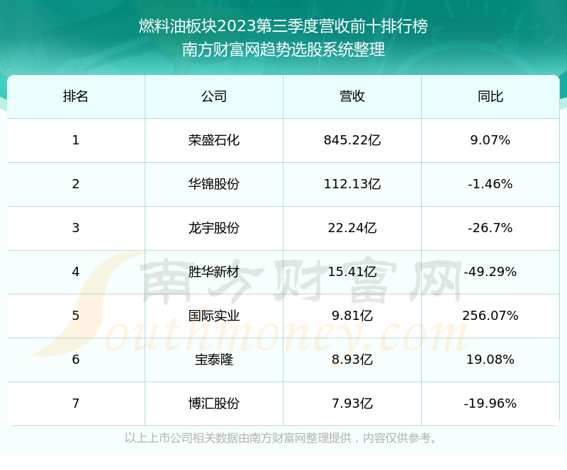 按照南方财富网趋势选股系统统计,该股所属板块为燃料油板块,该板块共有7只股票,*ST园城2023第三季度营收在该板块中排名为第7名,该板块2023第三季度营收排名前十的股票如下表: