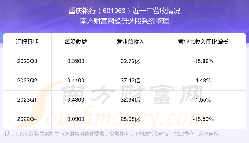 按照南方财富网趋势选股系统统计,该股所属板块为银行板块,该板块共有44只股票,重庆银行2023第三季度营收在该板块中排名为第31名,该板块2023第三季度营收排名前十的股票如下表: