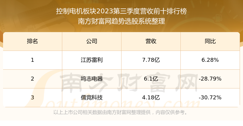 按照南方财富网趋势选股系统统计,该股所属板块为控制电机板块,该板块共有3只股票,鸣志电器2023第三季度营收在该板块中排名为第2名,该板块2023第三季度营收排名前十的股票如下表: