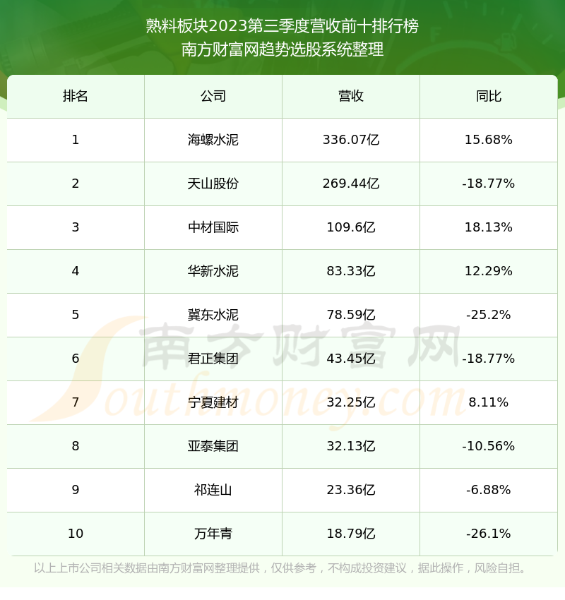 按照南方财富网趋势选股系统统计,该股所属板块为熟料板块,该板块共有19只股票,祁连山2023第三季度营收在该板块中排名为第9名,该板块2023第三季度营收排名前十的股票如下表: