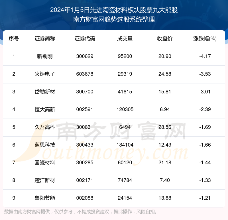 截止2024年1月5日,个股表现方面,先进陶瓷材料板块股票当日领跌股为新劲刚(300629),该股当日报收20.90,上涨-4.17%,成交量9.52万。火炬电子(603678)以下跌-3.53%紧随其后,该股当日成交量2.93万。此外,岱勒新材(300700)、恒大高新(002591)、久吾高科(300631)均进入当日先进陶瓷材料板块股票熊股之列。