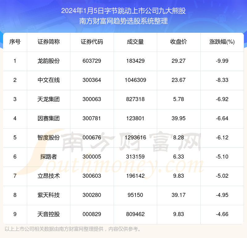 截止2024年1月5日,个股表现方面,字节跳动上市公司当日领跌股为龙韵股份(603729),该股当日报收29.27,上涨-9.99%,成交量18.34万。中文在线(300364)以下跌-8.33%紧随其后,该股当日成交量104.63万。此外,天龙集团(300063)、因赛集团(300781)、智度股份(000676)均进入当日字节跳动上市公司熊股之列。