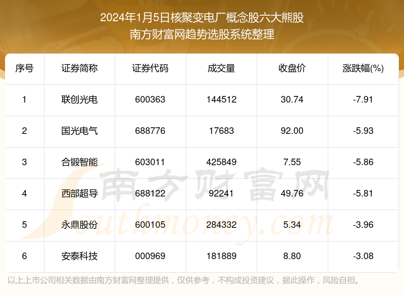 截止2024年1月5日,个股表现方面,核聚变电厂概念股当日领跌股为联创光电(600363),该股当日报收30.74,上涨-7.91%,成交量14.45万。国光电气(688776)以下跌-5.93%紧随其后,该股当日成交量1.77万。此外,合锻智能(603011)、西部超导(688122)、永鼎股份(600105)均进入当日核聚变电厂概念股熊股之列。