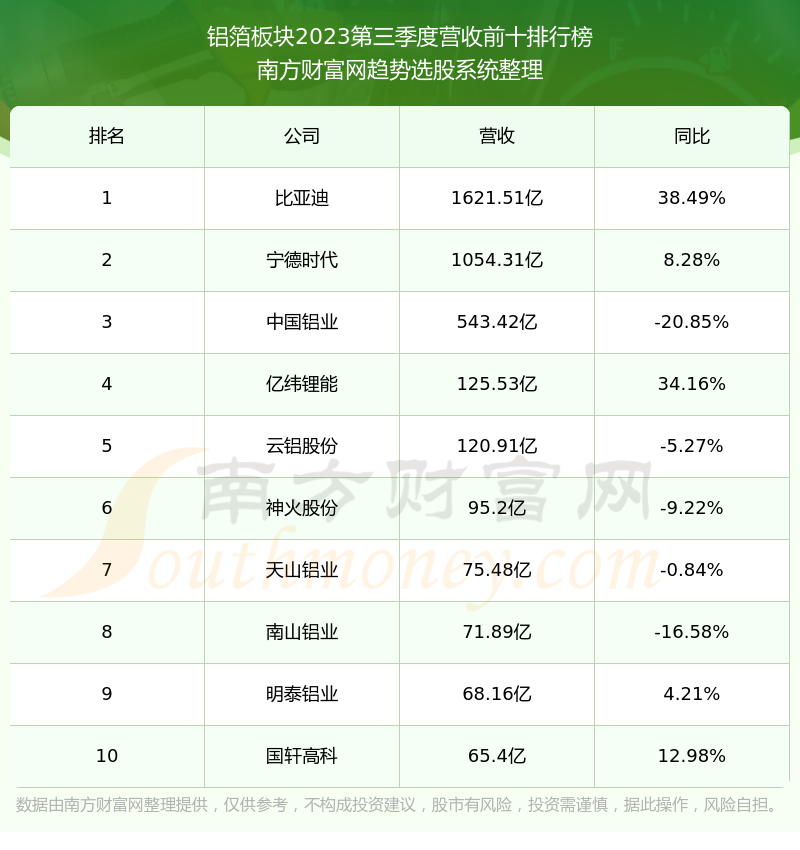 按照南方财富网趋势选股系统统计,该股所属板块为铝箔板块,该板块共有31只股票,艾华集团2023第三季度营收在该板块中排名为第31名,该板块2023第三季度营收排名前十的股票如下表: