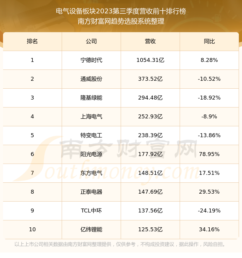 按照南方财富网趋势选股系统统计,该股所属板块为电气设备板块,该板块共有119只股票,杭州柯林2023第三季度营收在该板块中排名为第119名,该板块2023第三季度营收排名前十的股票如下表: