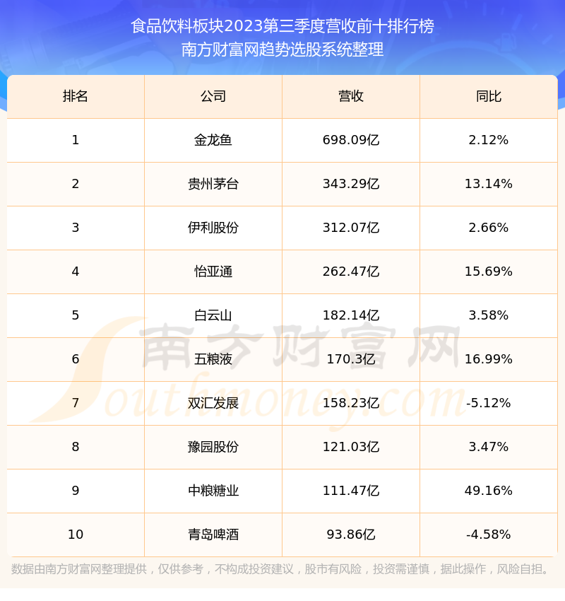 按照南方财富网趋势选股系统统计,该股所属板块为食品饮料板块,该板块共有232只股票,元祖股份2023第三季度营收在该板块中排名为第76名,该板块2023第三季度营收排名前十的股票如下表: