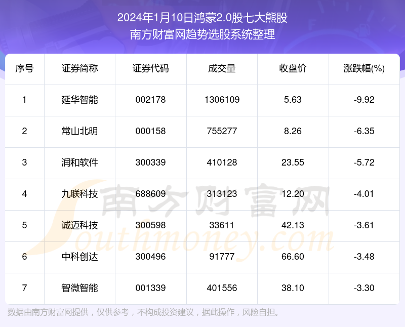截止2024年1月10日,个股表现方面,鸿蒙2.0股当日领跌股为延华智能(002178),该股当日报收5.63,上涨-9.92%,成交量130.61万。常山北明(000158)以下跌-6.35%紧随其后,该股当日成交量75.53万。此外,润和软件(300339)、九联科技(688609)、诚迈科技(300598)均进入当日鸿蒙2.0股熊股之列。