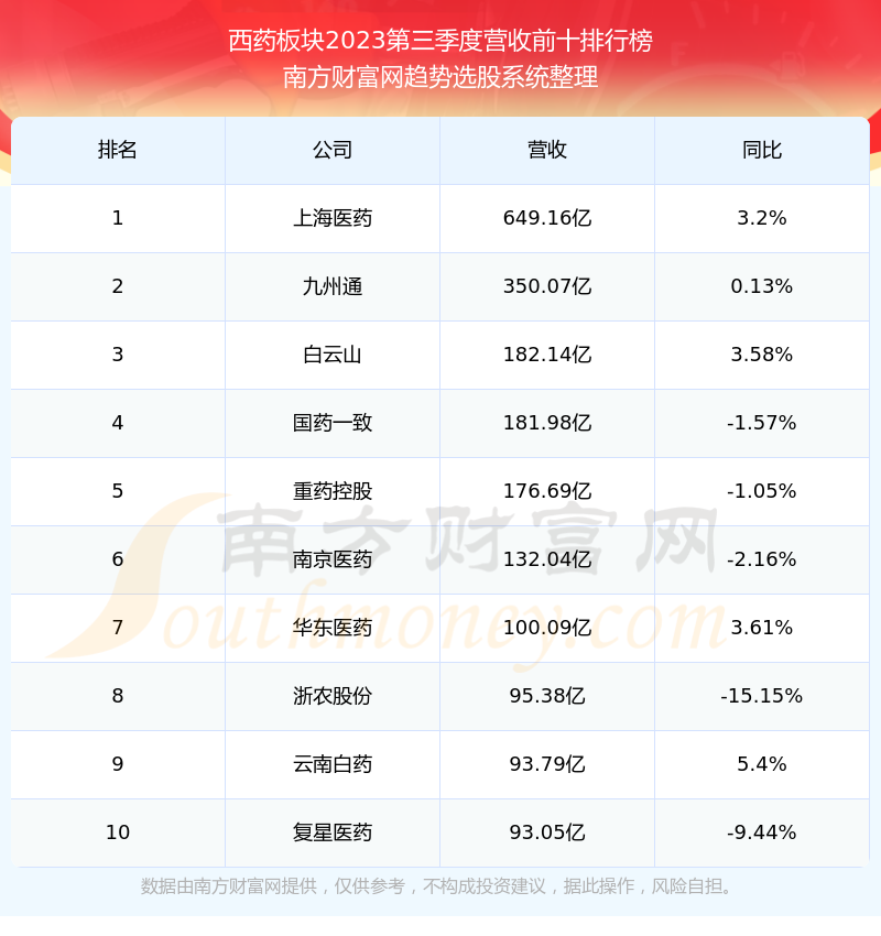按照南方财富网趋势选股系统统计,该股所属板块为西药板块,该板块共有44只股票,达仁堂2023第三季度营收在该板块中排名为第22名,该板块2023第三季度营收排名前十的股票如下表: