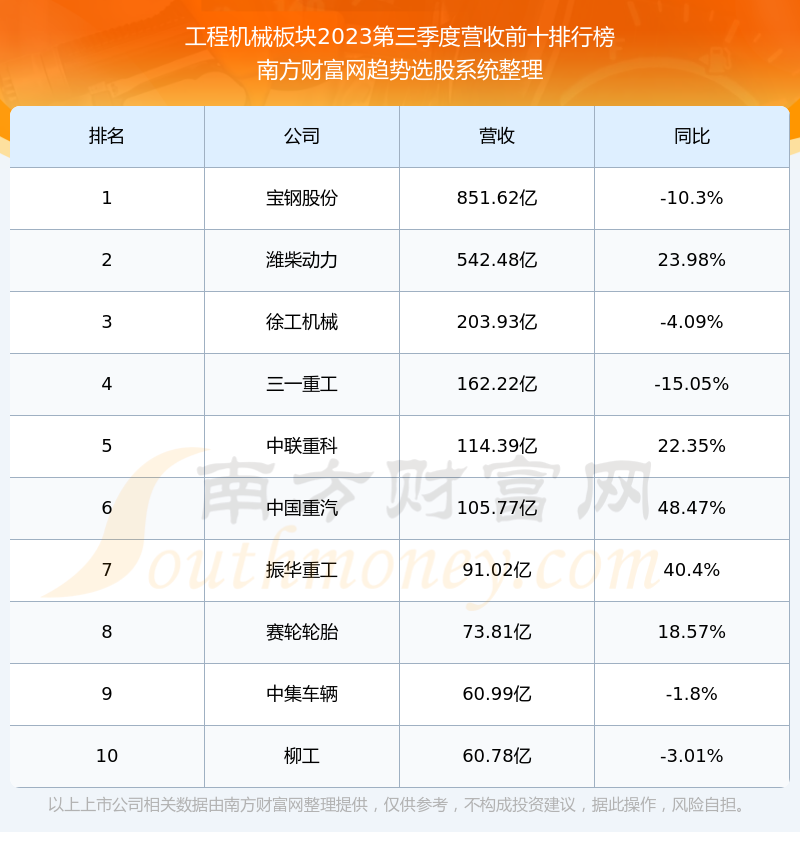 按照南方财富网趋势选股系统统计,该股所属板块为工程机械板块,该板块共有72只股票,铁建重工2023第三季度营收在该板块中排名为第23名,该板块2023第三季度营收排名前十的股票如下表: