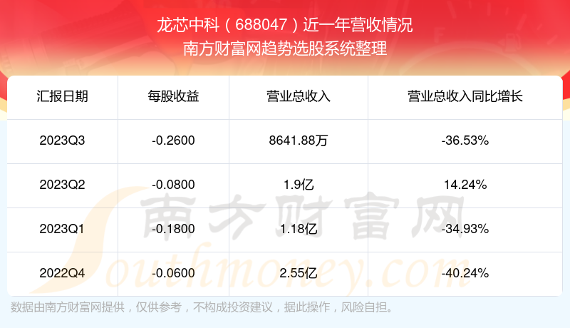 按照南方财富网趋势选股系统统计,该股所属板块为芯片板块,该板块共有547只股票,龙芯中科2023第三季度营收在该板块中排名为第504名,该板块2023第三季度营收排名前十的股票如下表: