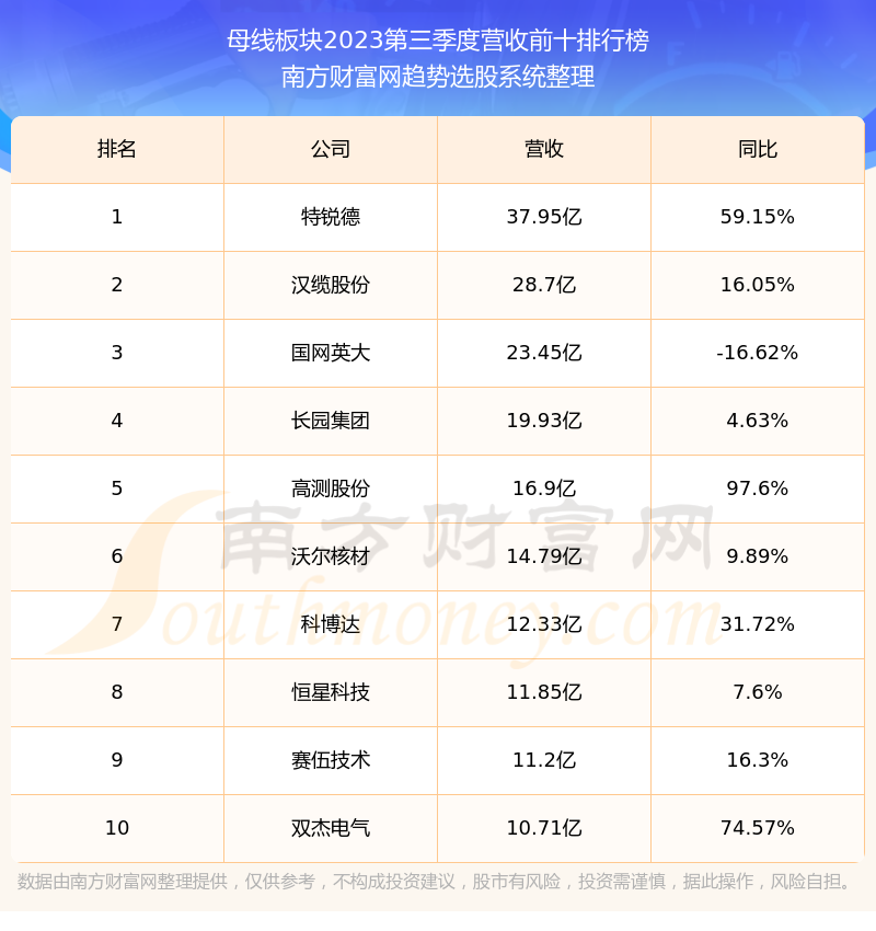 按照南方财富网趋势选股系统统计,该股所属板块为母线板块,该板块共有14只股票,威腾电气2023第三季度营收在该板块中排名为第11名,该板块2023第三季度营收排名前十的股票如下表: