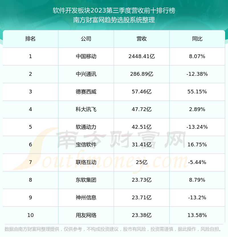 按照南方财富网趋势选股系统统计,该股所属板块为软件开发板块,该板块共有195只股票,致远互联2023第三季度营收在该板块中排名为第99名,该板块2023第三季度营收排名前十的股票如下表: