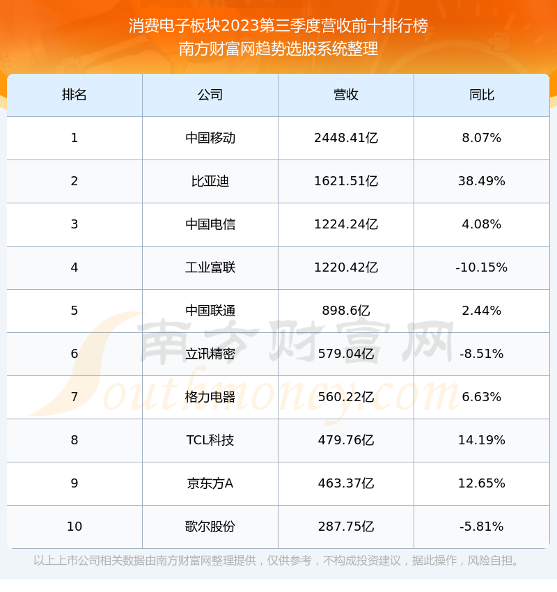 按照南方财富网趋势选股系统统计,该股所属板块为消费电子板块,该板块共有354只股票,环旭电子2023第三季度营收在该板块中排名为第18名,该板块2023第三季度营收排名前十的股票如下表: