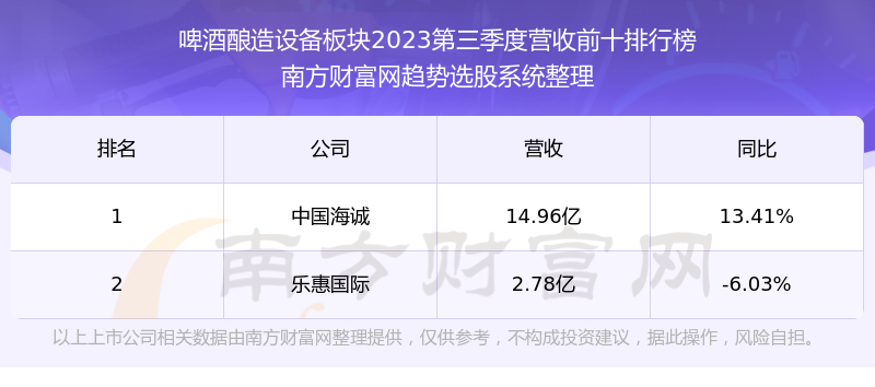 按照南方财富网趋势选股系统统计,该股所属板块为啤酒酿造设备板块,该板块共有2只股票,乐惠国际2023第三季度营收在该板块中排名为第2名,该板块2023第三季度营收排名前十的股票如下表: