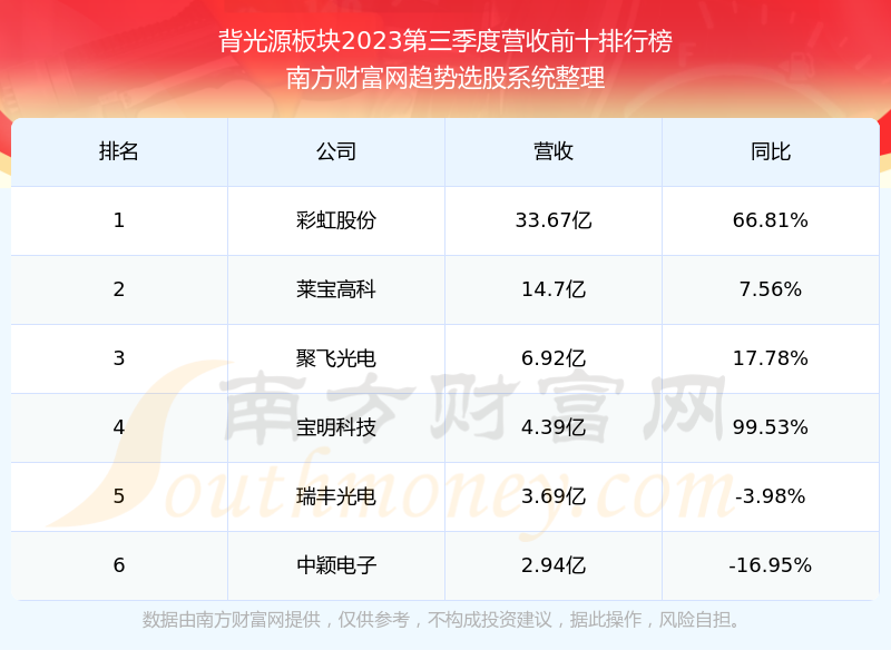 按照南方财富网趋势选股系统统计,该股所属板块为背光源板块,该板块共有6只股票,联创光电2023第三季度营收在该板块中排名为第6名,该板块2023第三季度营收排名前十的股票如下表: