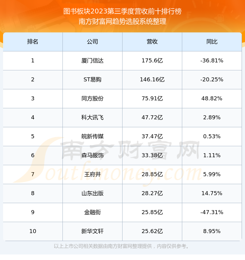 按照南方财富网趋势选股系统统计,该股所属板块为图书板块,该板块共有64只股票,新经典2023第三季度营收在该板块中排名为第48名,该板块2023第三季度营收排名前十的股票如下表: