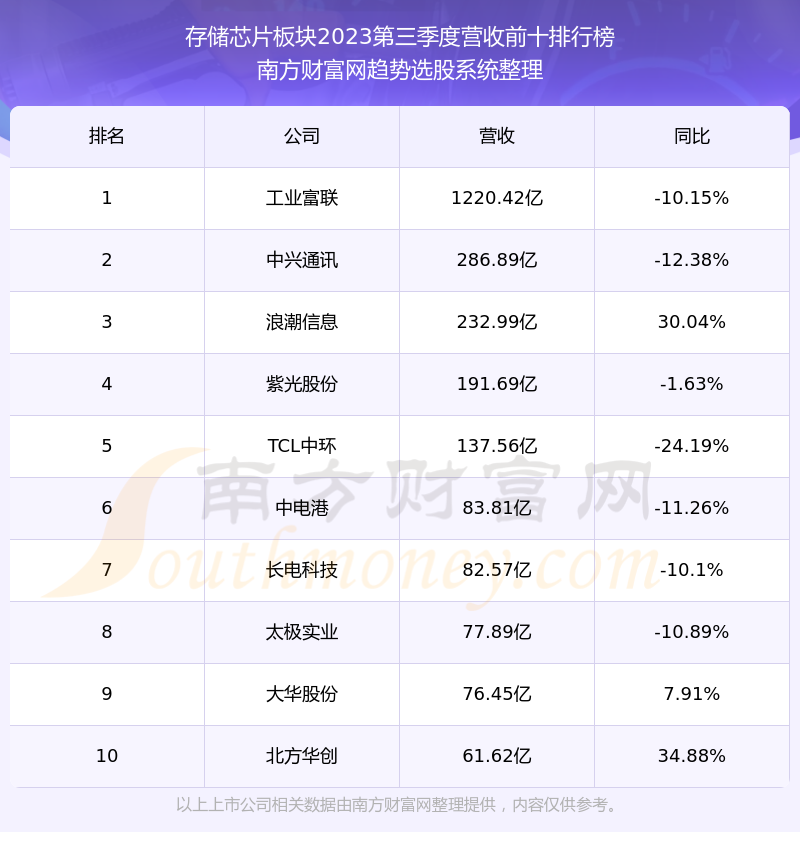 按照南方财富网趋势选股系统统计,该股所属板块为存储芯片板块,该板块共有110只股票,聚辰股份2023第三季度营收在该板块中排名为第94名,该板块2023第三季度营收排名前十的股票如下表: