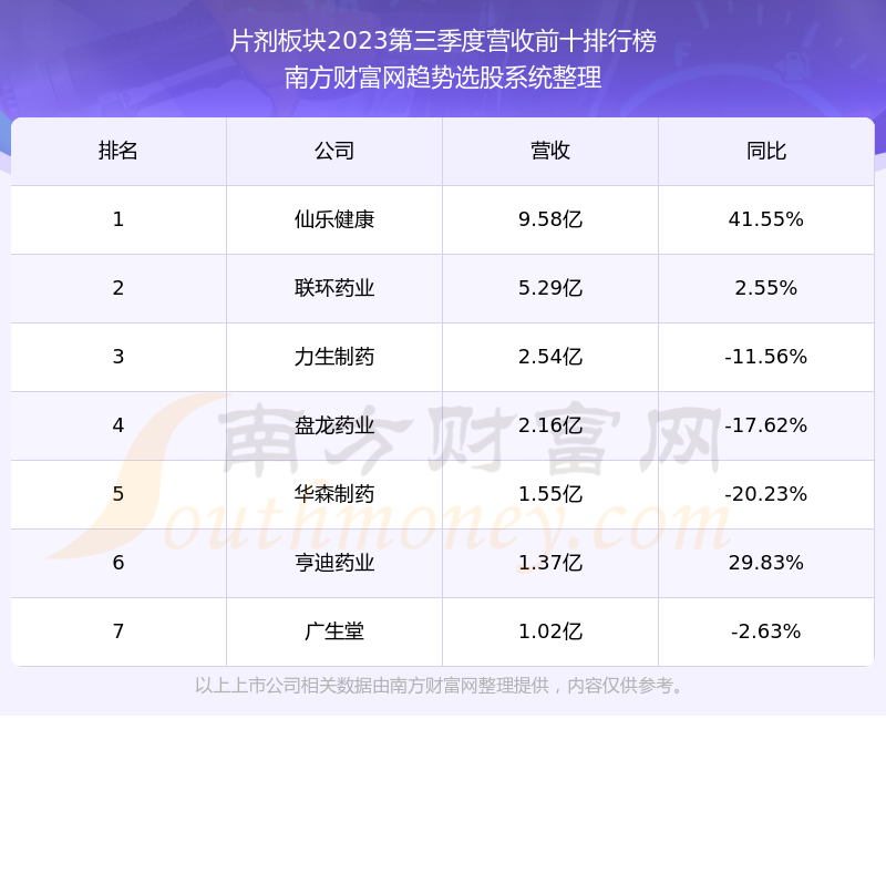 按照南方财富网趋势选股系统统计,该股所属板块为片剂板块,该板块共有7只股票,奥翔药业2023第三季度营收在该板块中排名为第7名,该板块2023第三季度营收排名前十的股票如下表: